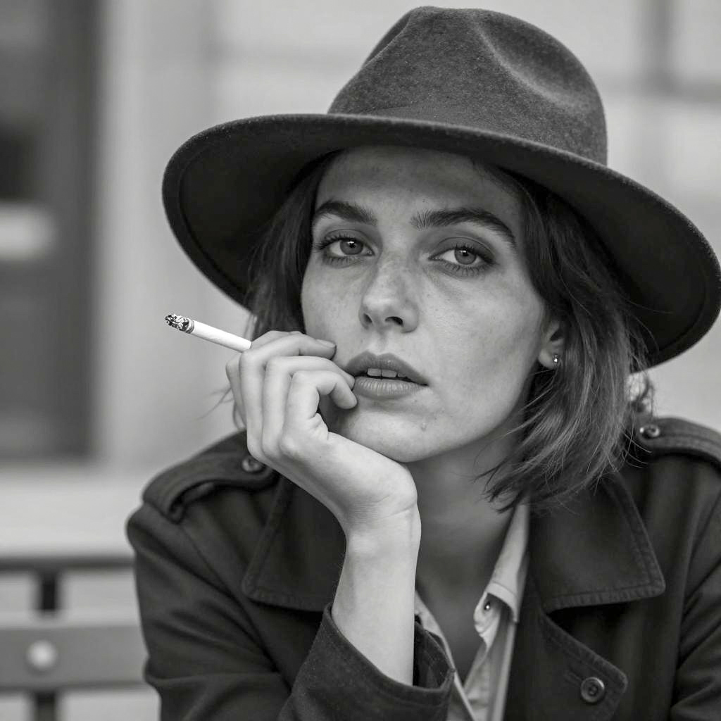 Black and white photograph of a woman with pale skin and dark hair, wearing a wide-brimmed hat. She holds a cigarette near her mouth, resting her chin on her hand. Her expression is intense and focused. She wears a dark jacket over a light-colored shirt. The background is blurred, suggesting an outdoor setting with indistinct objects.