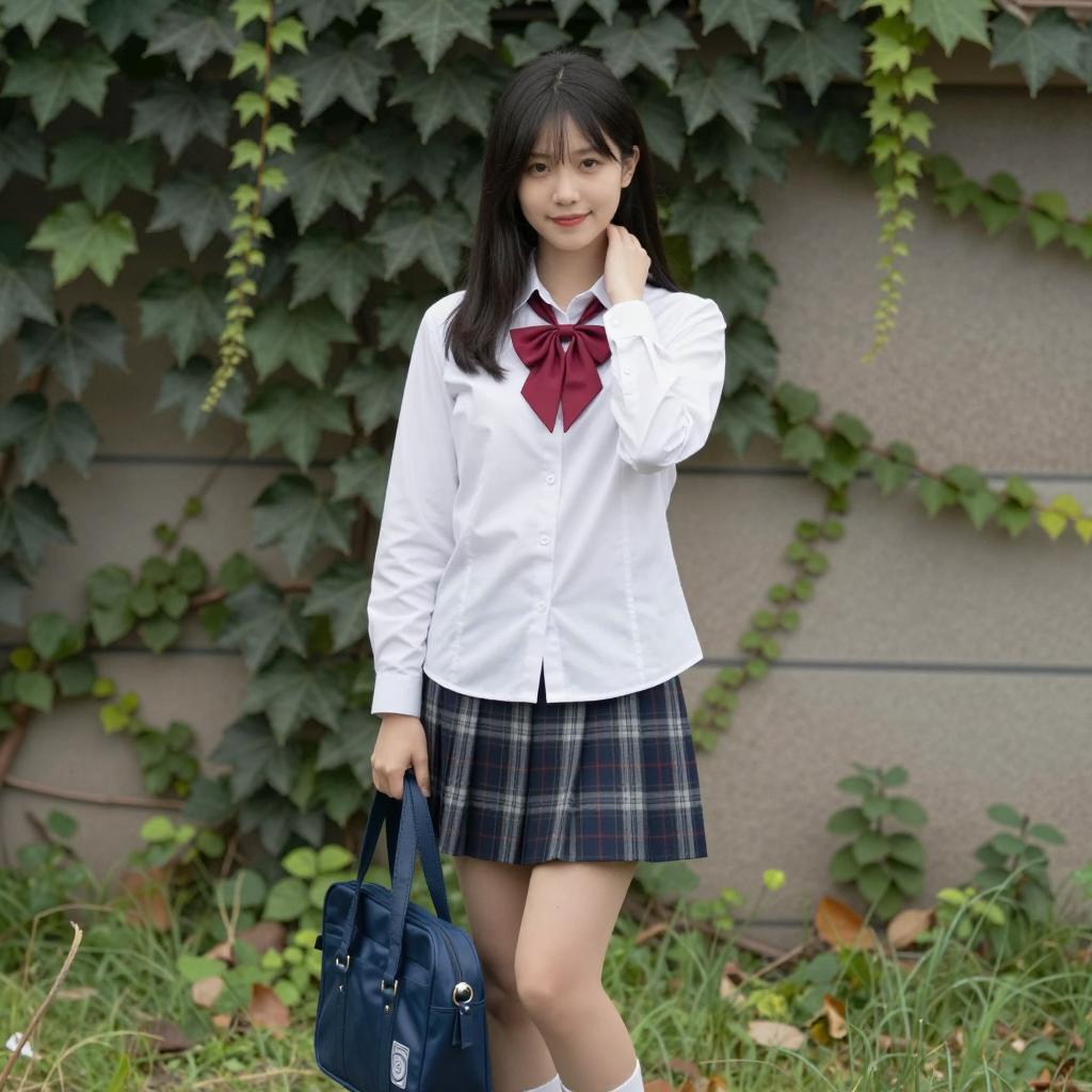 Asian girl with long black hair, wearing a white sailor uniform with navy blue trim and a red necktie, black pleated skirt, and knee-high navy socks. She stands outside on a wooden deck, smiling, with a black bag over her shoulder. Background includes white building, green bushes, and trees. Bright daylight.
