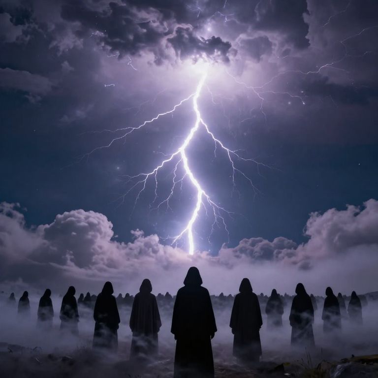 A celestial spectacle unfolds as a radiant bolt of lightning pierces the heavens, illuminating a gathering of cloaked figures who stand in awe beneath a swirling tapestry of clouds, their forms dwarfed by the cosmic drama above.