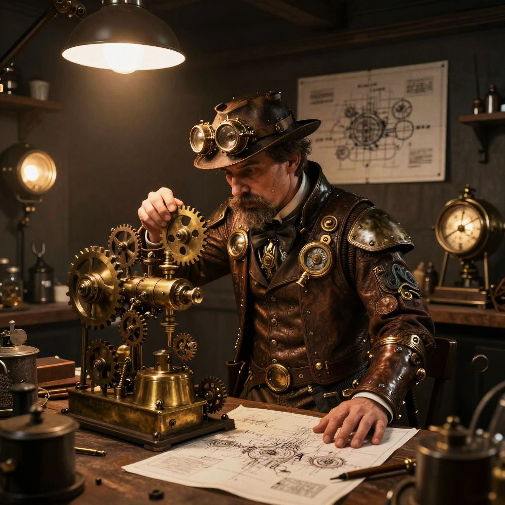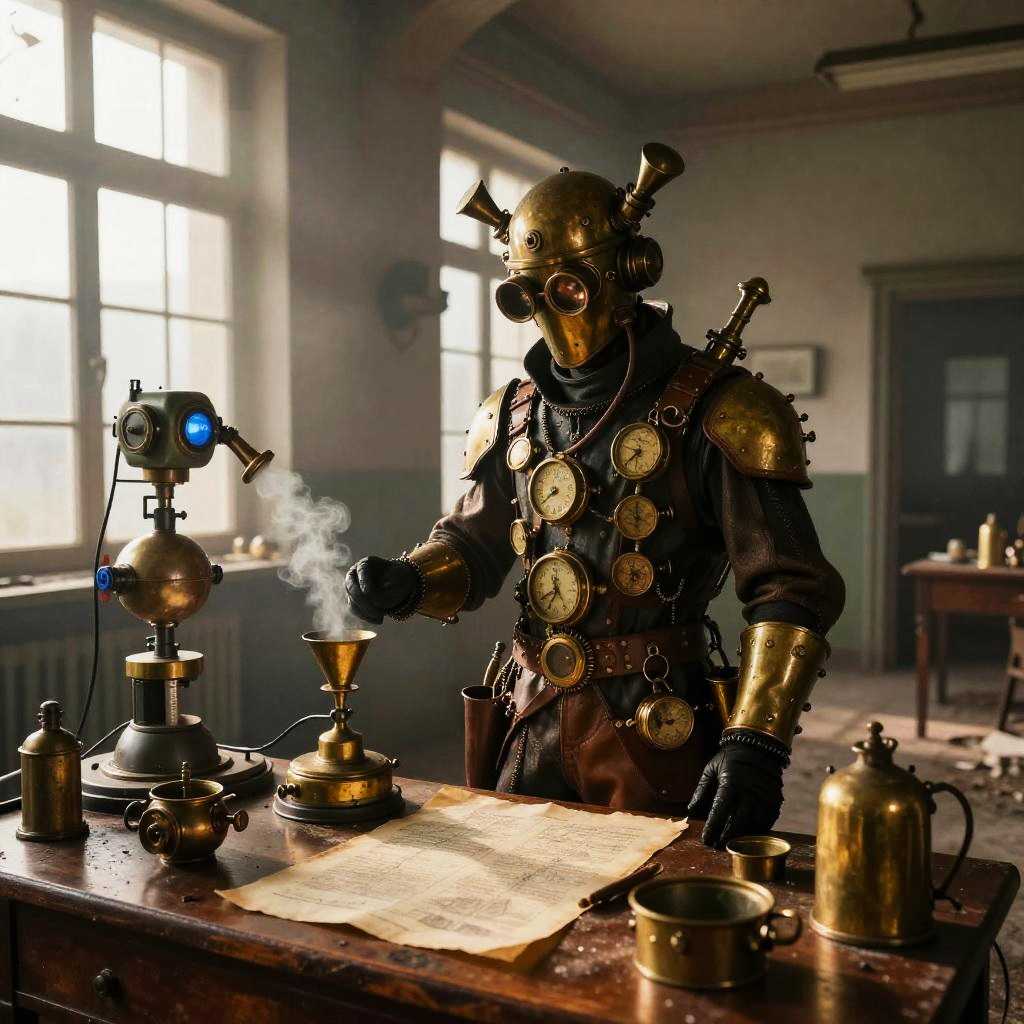 Steampunk medic exploring an abandoned hospital, wearing a complex ensemble of brass and leather gadgets, with steam-powered medical robots assisting, foggy atmosphere, vintage medical charts on wooden tables, golden hour light streaming through dusty windows.