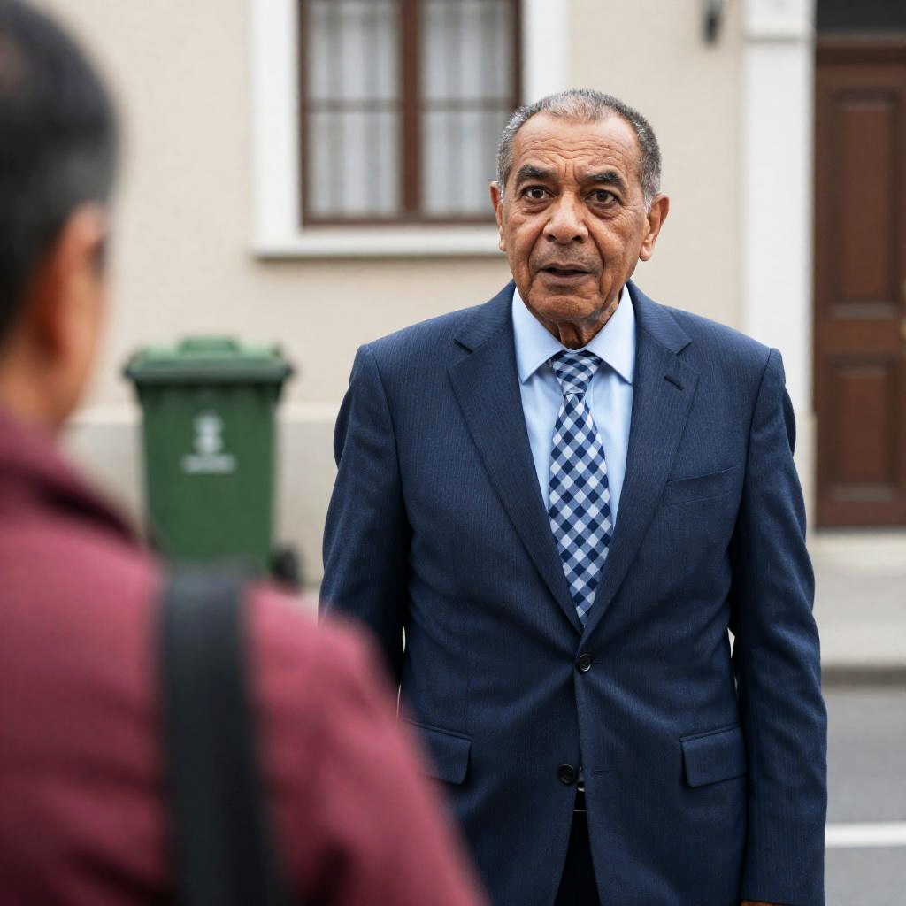 Photograph of an elderly man in a military uniform, hat, and gloves, walking through heavy rain. His face is partially obscured by raindrops. Dark blue uniform, chain around neck. Background is blurry with rain. Upper body centered.