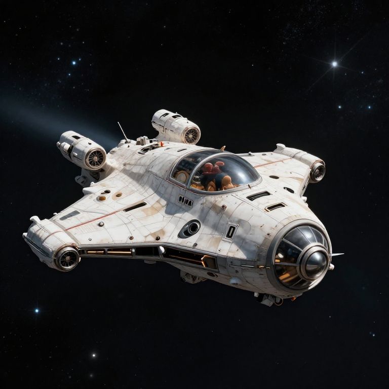 The Genie A beat-up small space ship for a single family is flying through space out among the stars. Hyper realistic 4K.,