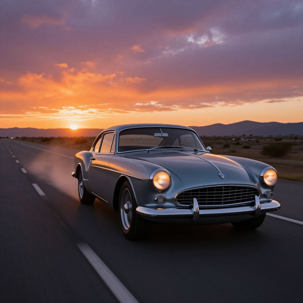 Arnolds as a classic car model cruising down an open highway at sunset, orange and purple sky reflecting off polished chrome and sleek lines, dramatic perspective emphasizing speed and freedom, cinematic mood with dust trails and distant mountains.