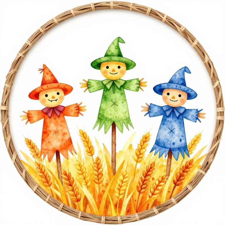 The image features a round sign with a whimsical, doodle art style, showcasing three cute scarecrows in a colorful, neon watercolor palette. The sign is bordered with a rustic, woven texture, adding a touch of rustic charm. Each scarecrow is uniquely colored and adorned with a hat and a stick, standing tall in a field of golden wheat. The scarecrows are arranged in a triangular formation, with one in the center and two flanking it on either side. The vibrant colors of the scarecrows—orange, green, and blue—stand out against the warm hues of the wheat field, creating a playful and cheerful atmosphere. The overall composition is balanced, with the scarecrows evenly spaced and the sign's circular shape providing a sense of unity and harmony.