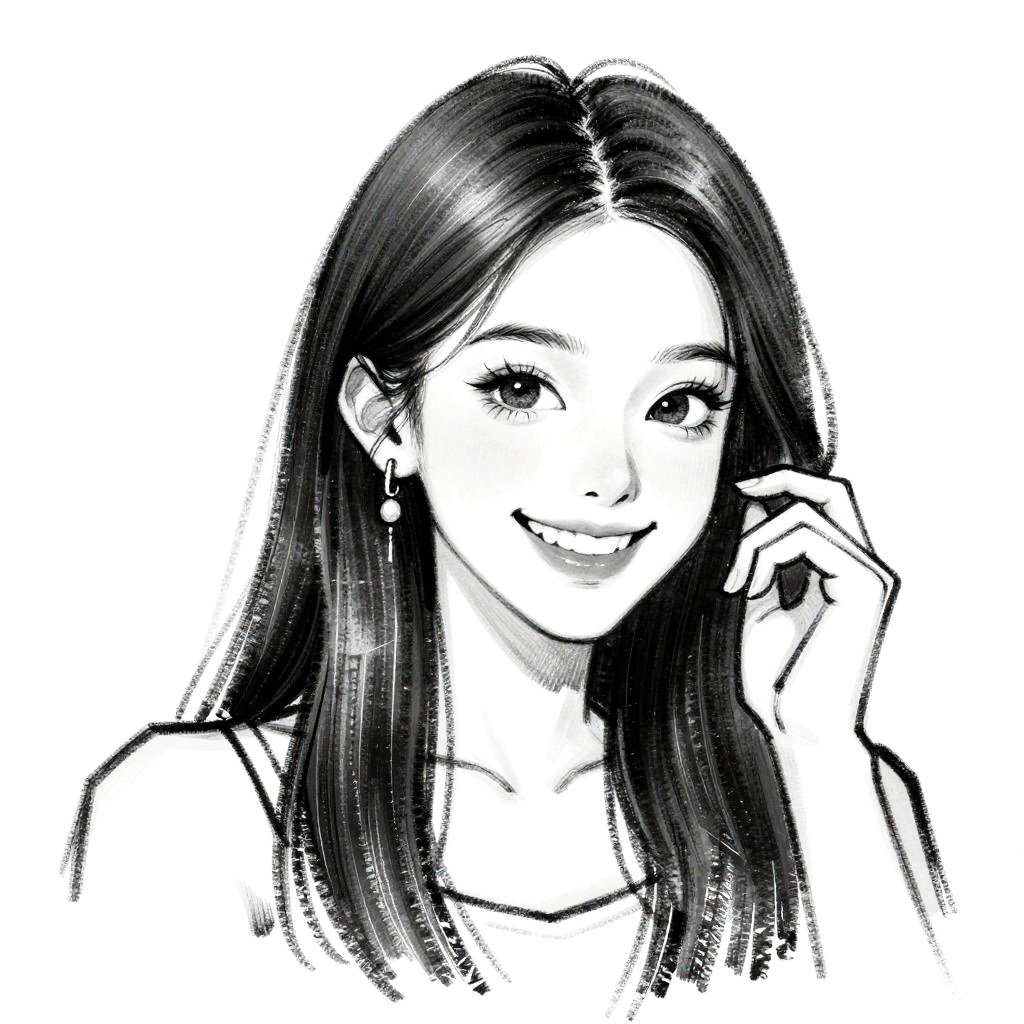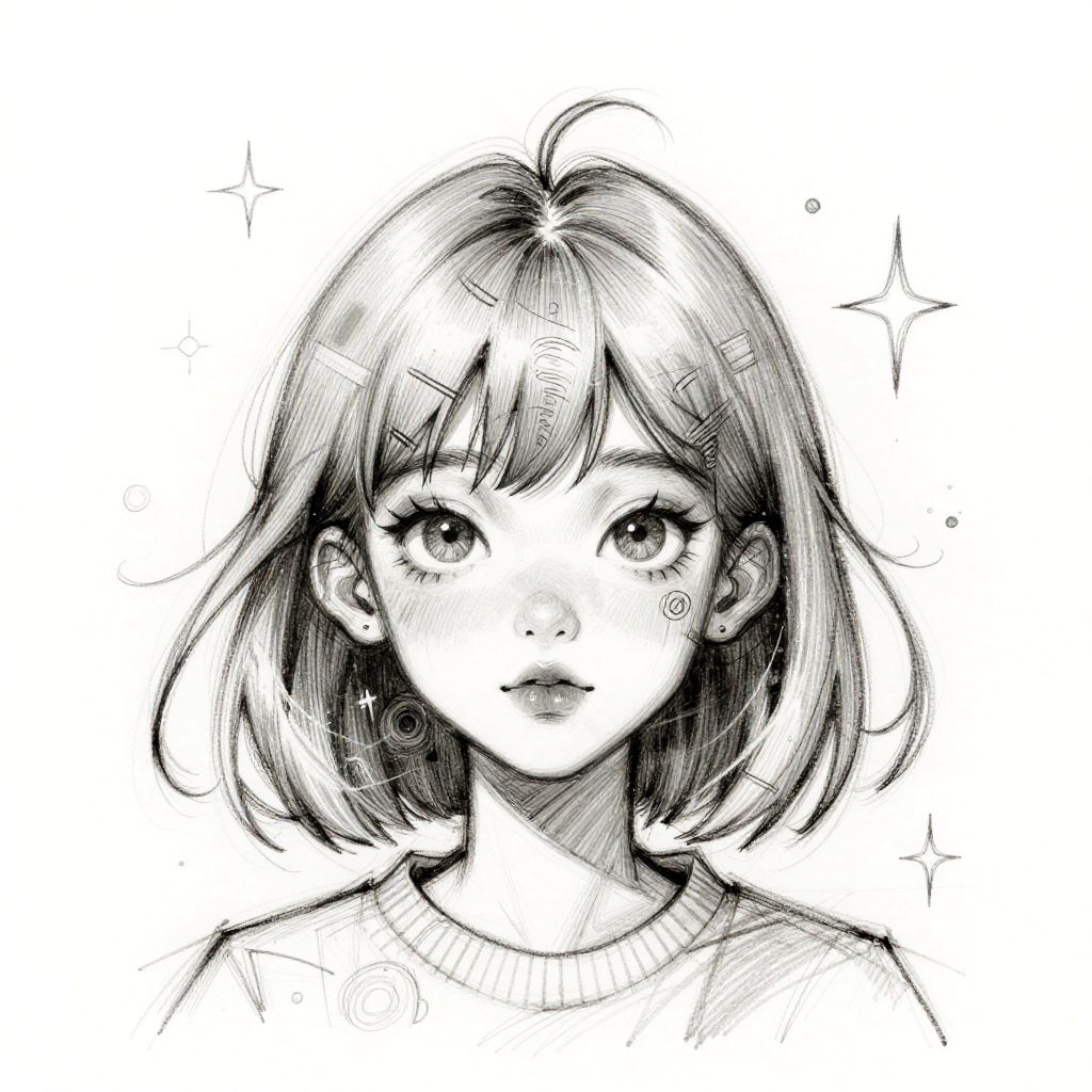 Bangs sketch of a whimsical character with exaggerated bangs, playful lines, imaginative design, intricate details, light and airy composition, sketchbook style