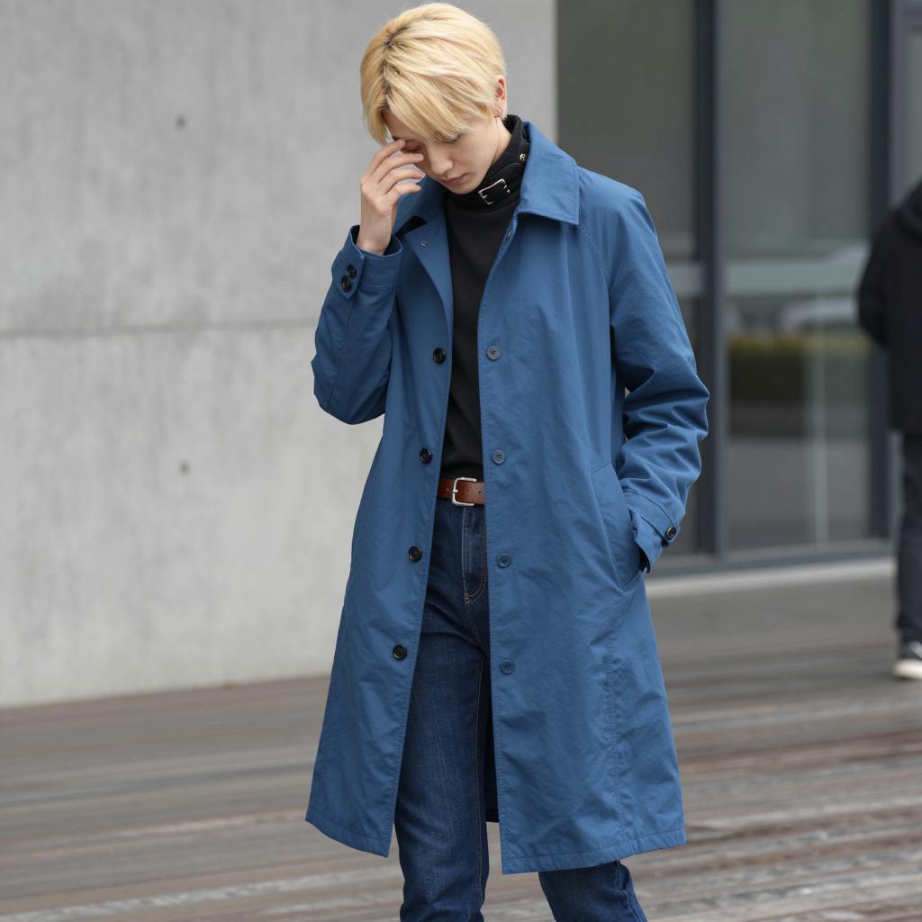 Photograph of a person with short blonde hair, wearing a long blue button-up coat, dark blue jeans, and a brown belt. The person's head is tilted to the side, right hand touching their face, and left hand in pocket. They wear a black collar with a silver buckle. Background: concrete wall, blurred glass window, and another person partially visible on the right. Textured wooden floor.