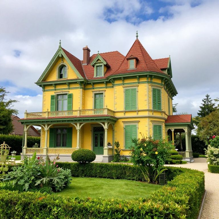 Stately Victorian-style house at Rueil, featuring a vibrant yellow facade, green shutters, and a red-tiled roof, surrounded by lush gardens and manicured shrubs under a partly cloudy sky.