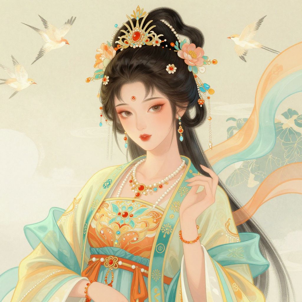 A vibrant digital illustration inspired by traditional Chinese art, featuring a beautifully adorned woman in ornate attire, with intricate floral headpieces and flowing robes, set against a soft, ethereal background with subtle bird motifs.