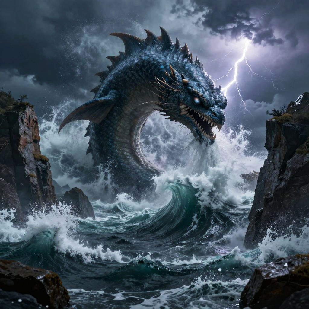 Digital artwork of a massive, dark blue, dragon-like sea creature with sharp, jagged scales and glowing yellow eyes, emerging from turbulent ocean waves. Lightning illuminates the stormy, cloudy sky, casting an eerie glow on the creature's menacing, open mouth with sharp teeth. Waves crash dramatically against rocky cliffs on either side, enhancing the chaotic scene. The dragon's serpentine body curves upwards, adding a sense of power and movement. The overall color palette is dark and stormy, with blue, black, and white dominating the image.