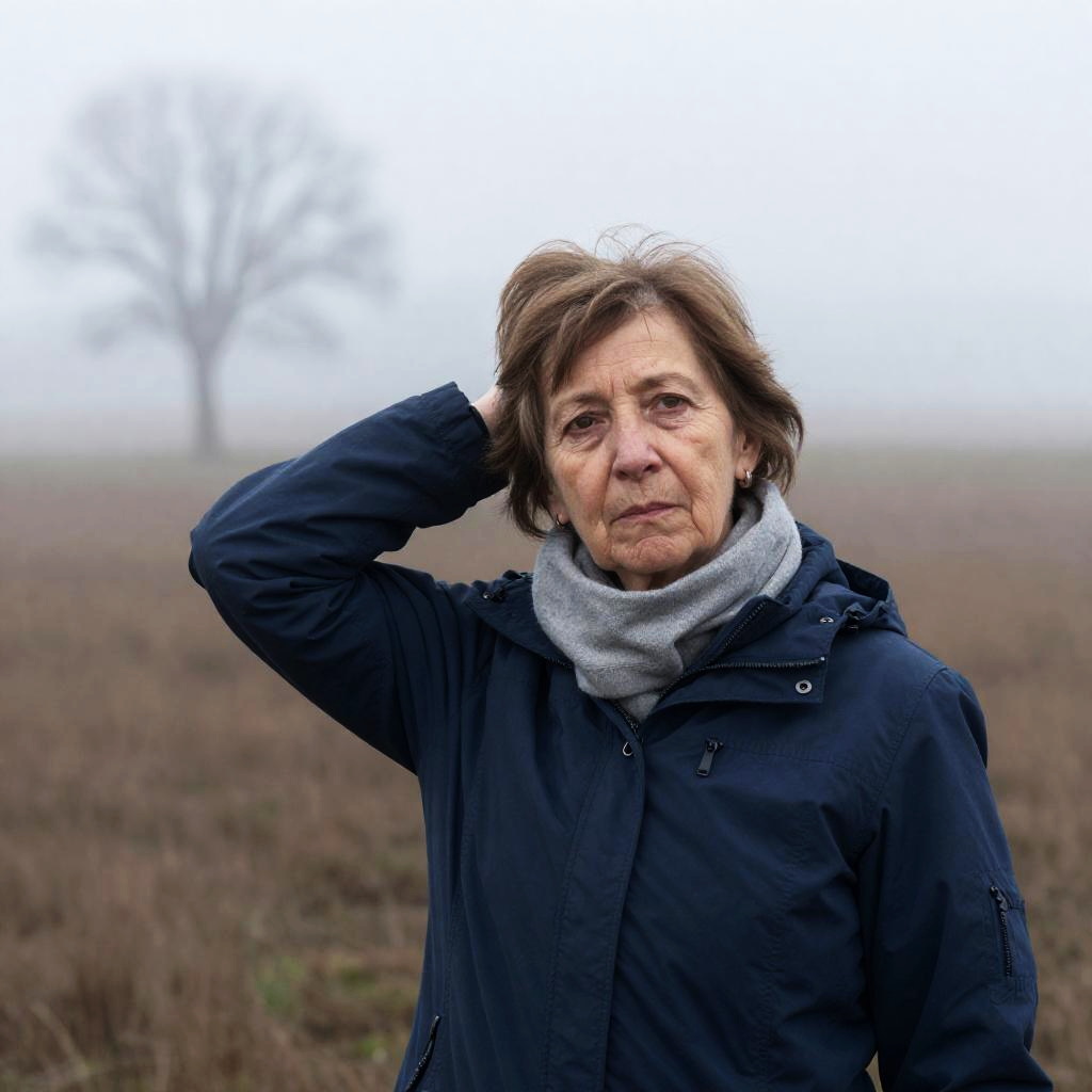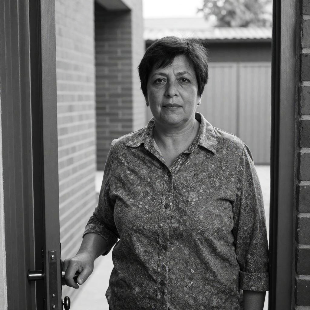 Black and white photograph of a middle-aged woman with short dark hair, standing in a doorway, wearing a patterned button-up shirt, holding the door handle. Background shows brick walls and a fenced outdoor area. She has a neutral expression.