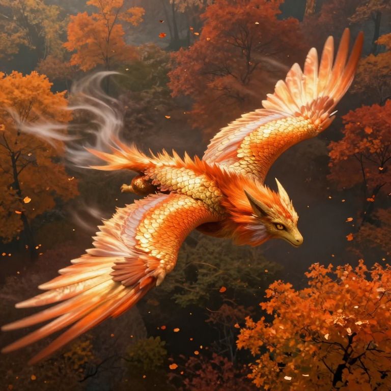 A majestic mythical creature soars through an enchanting autumn landscape, its scales reflecting vibrant hues of orange and gold reminiscent of the falling leaves, as viewed from an aerial perspective. The creature's intense gaze conveys a sense of ancient wisdom, while its powerful wings create a gentle breeze that rustles the surrounding foliage. This awe-inspiring scene merges the mystical allure of mythical creatures with the tranquility of nature, evoking both wonder and serenity in a dreamlike fantasy world.