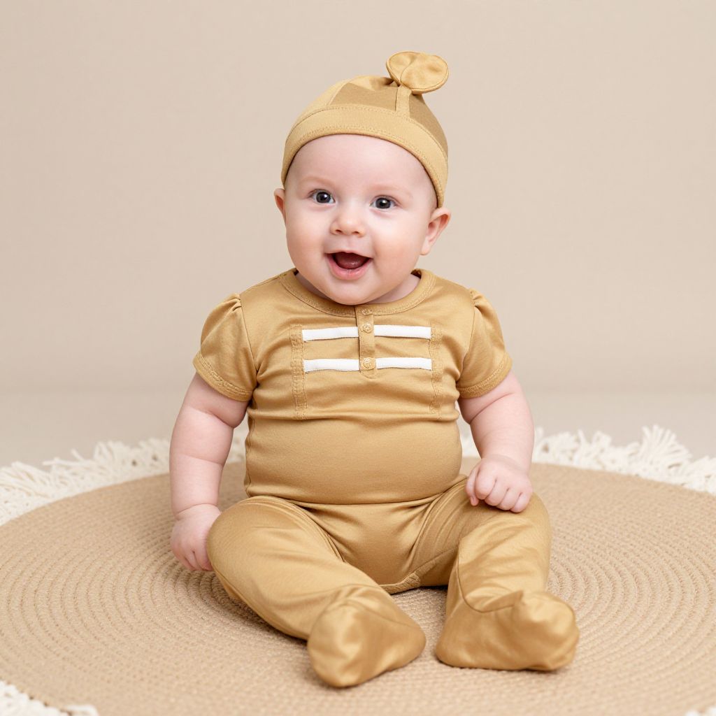 Photograph of a smiling baby with fair skin, wearing a golden outfit and matching hat, sitting on a beige circular mat.