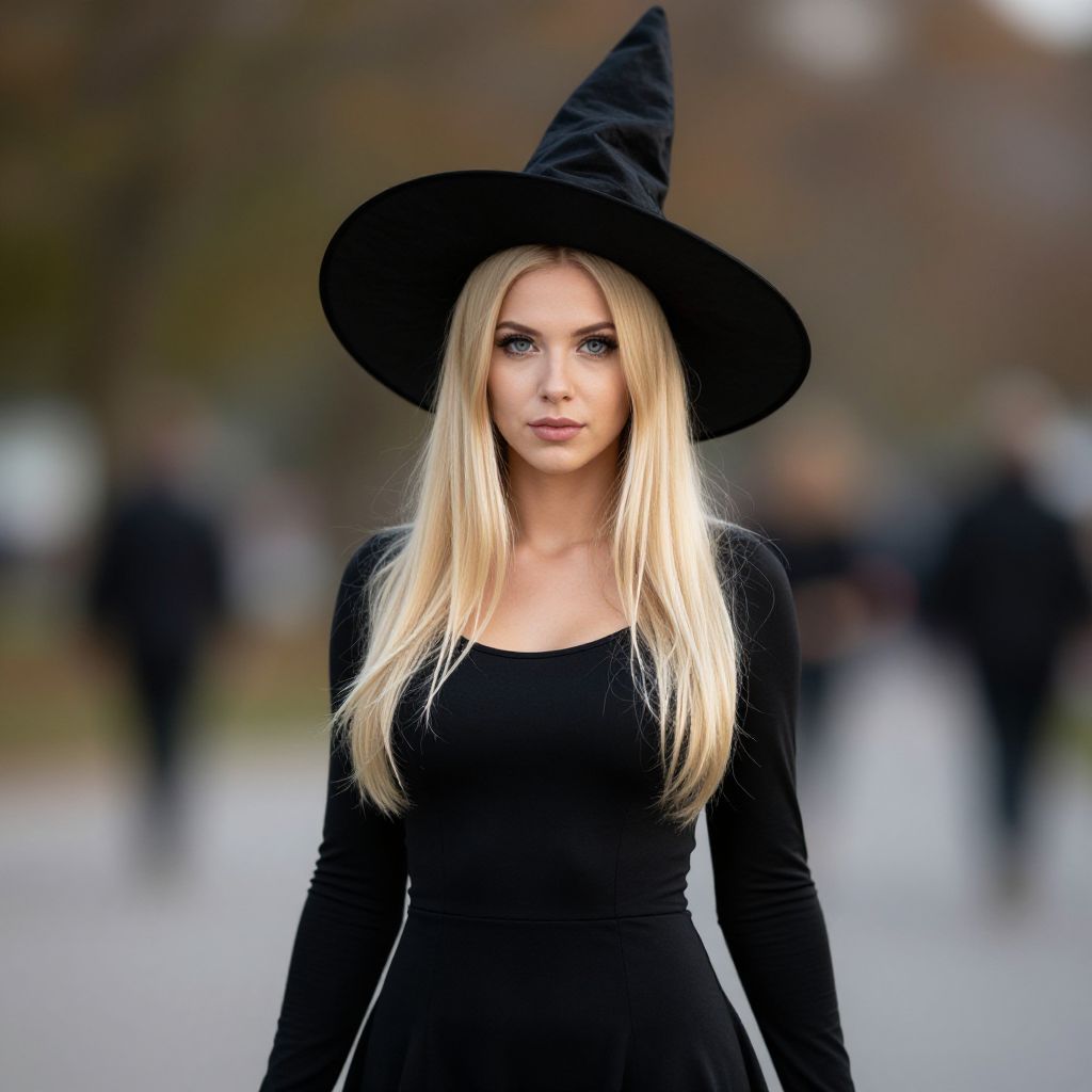 Photograph of a young blonde woman with braided hair wearing a black witch hat and dress, standing in a blurred outdoor setting.