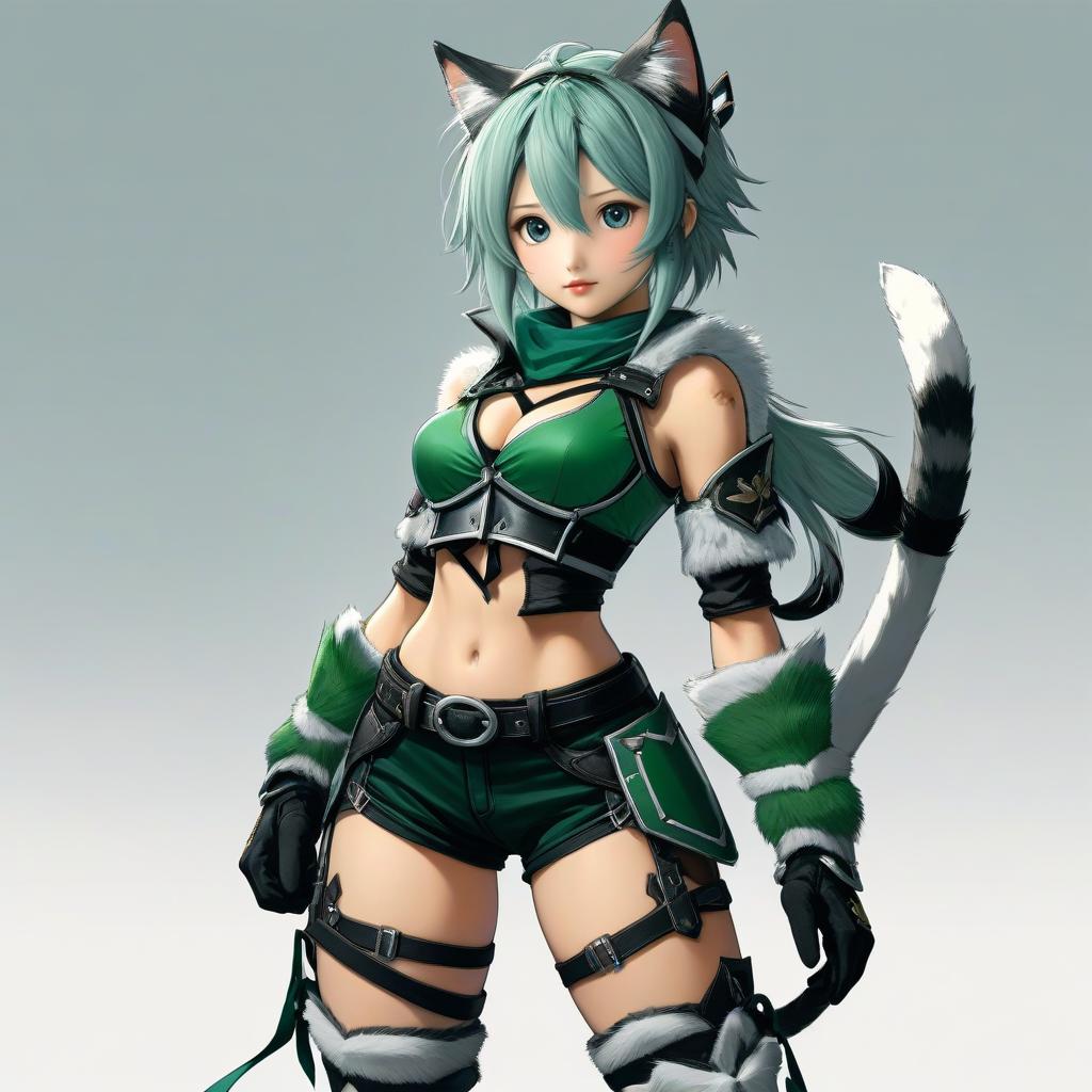 Masterpiece, best quality, highres, 1girl, sinon1, animal ears, black ribbon, black shorts, breastplate, hair ribbon, short shorts, cat tail, midriff, fingerless gloves, thigh strap, sidelocks, green armor, shoulder armor, cowboy shot, standing
