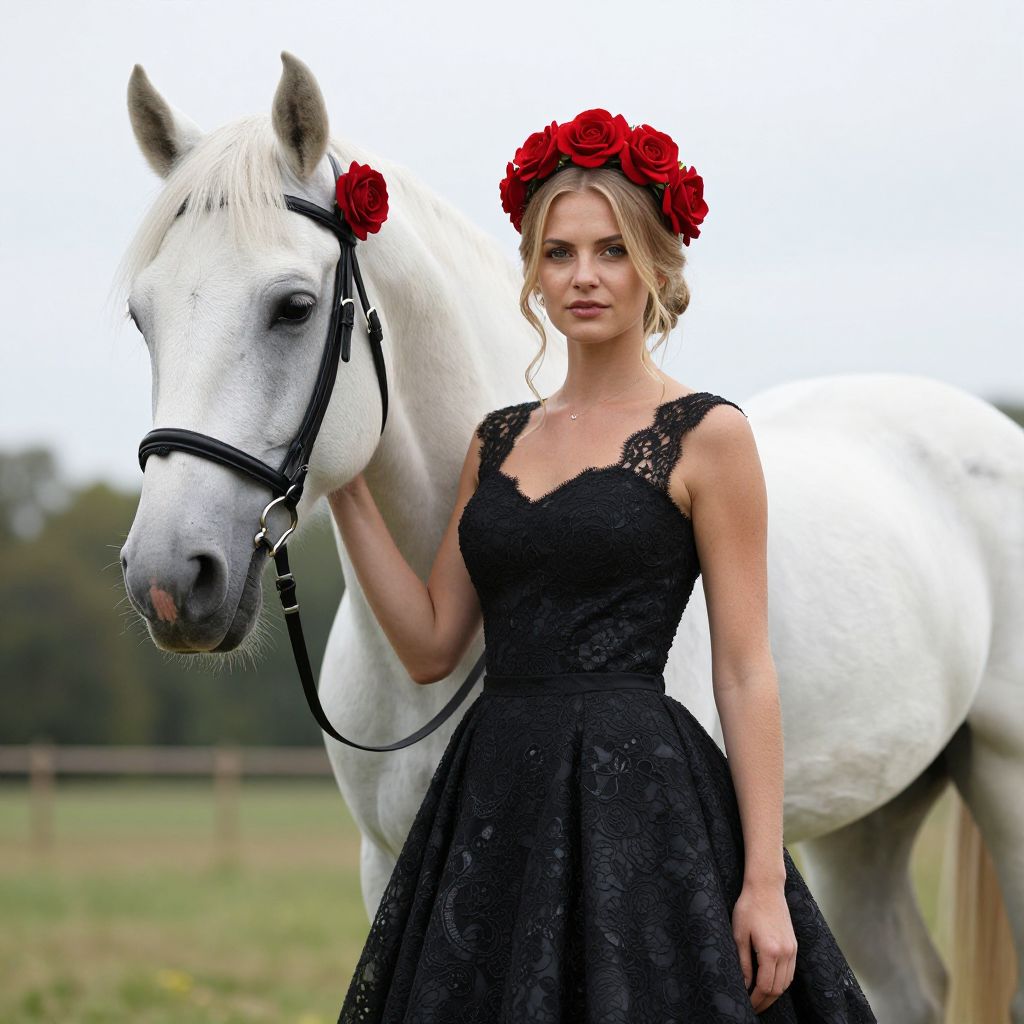 Photograph of a blonde woman with fair skin and blue eyes, wearing a black lace dress with a V-neck and a red rose crown. She stands confidently beside a white horse with a black bridle, adorned with a matching red rose on its head. The background shows a blurred, green grassy field and a wooden fence. The woman's hair is styled in an updo, and her expression is calm and poised. The image has a slightly overexposed, surreal quality.