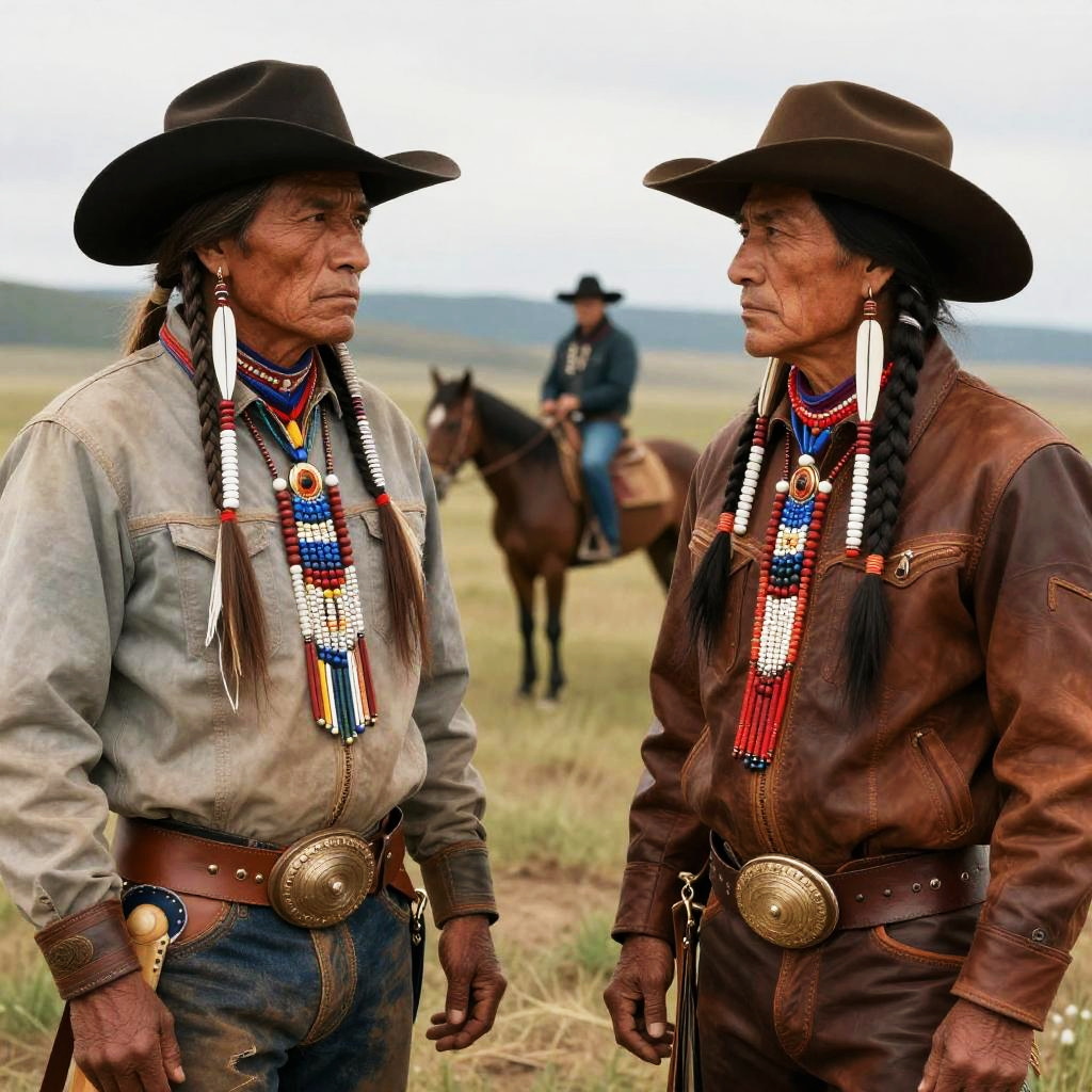 Western culture images illustrating traditional Native American influences merged with cowboy life, intricate beadwork and leather garments against a rugged wilderness backdrop.