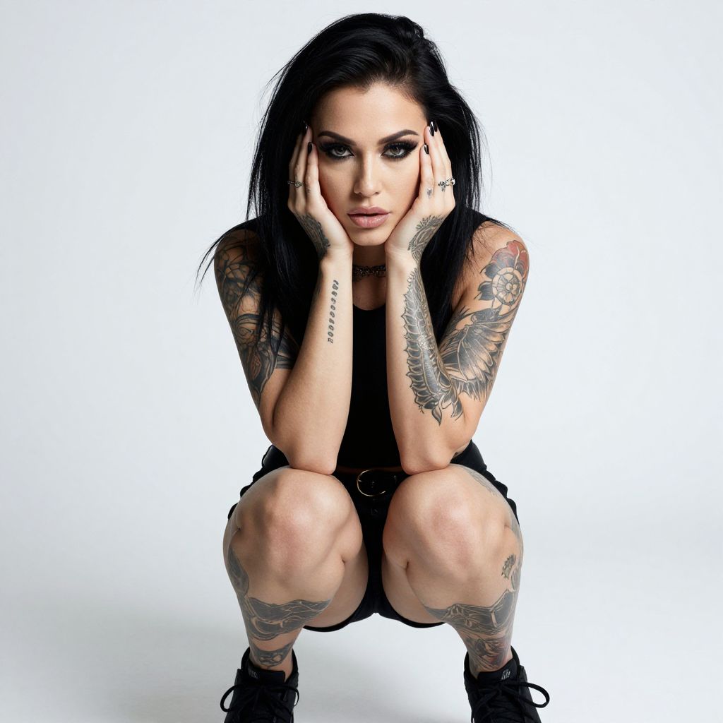 Photograph of a tattooed woman with long black hair, crouching against a plain white background. She's wearing a black sleeveless top and black shorts, with black sneakers. Her hands rest on her face, showcasing intricate tattoos on her arms, legs, and hands. She has dark, bold makeup with defined eyebrows and full lips. The lighting is soft, highlighting her tattoos and intense gaze.