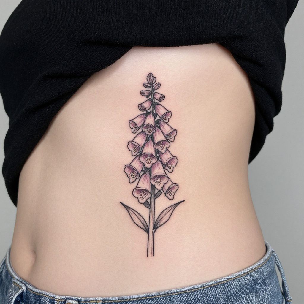 Animating Principles small fineline tattoo of foxglove flowers on a woman’s hip, foxglove flower, ignorant style tattoo,