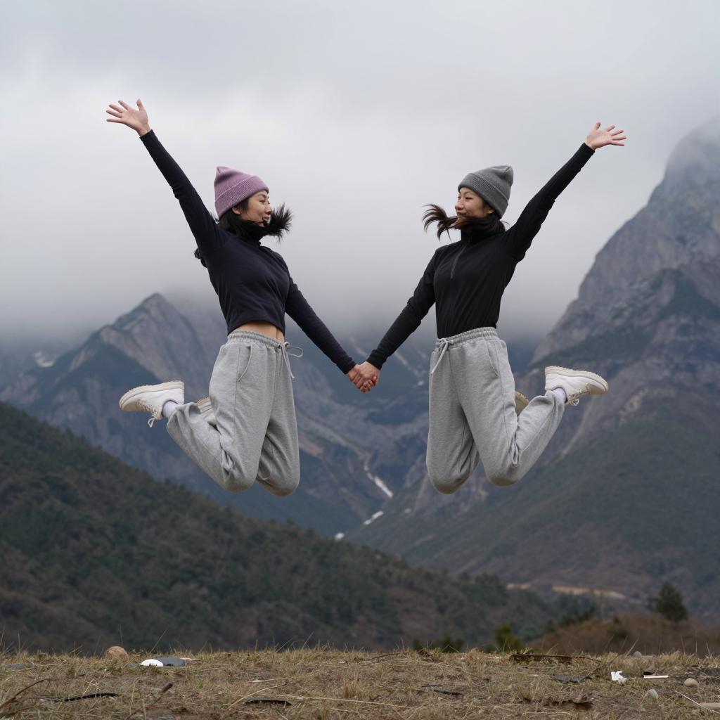 Two women jumping in mid-air, holding hands. Left woman in dark long-sleeve top, gray sweatpants, white sneakers, light purple beanie. Right woman in black long-sleeve top, gray sweatpants, white sneakers, gray beanie. Mountainous landscape with clouds, green forest, and rocky peaks in background. Both arms raised.