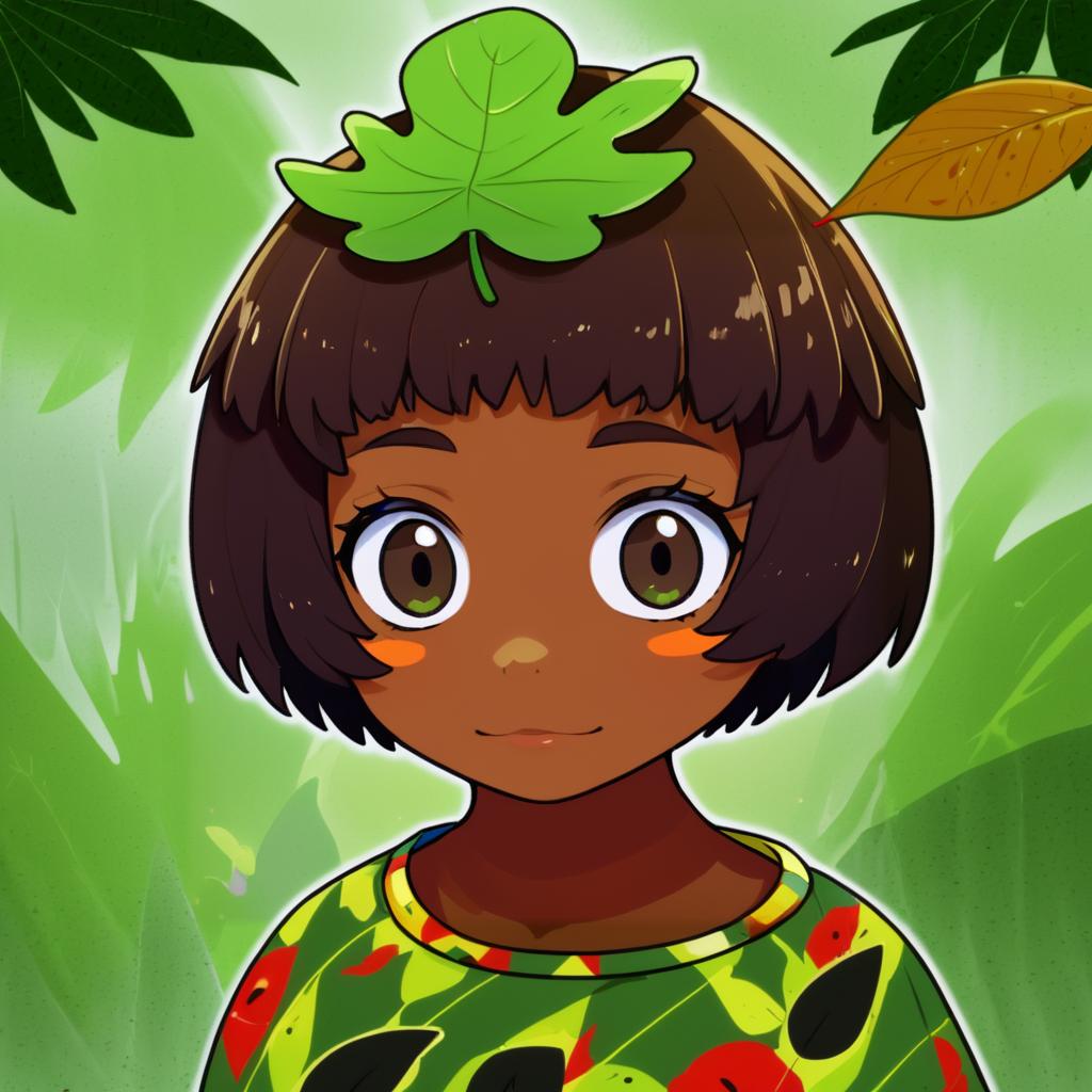 Anime illustration of a dark-skinned female character with short brown hair and brown eyes, wearing a colorful leaf-patterned shirt. A large green leaf is placed on her head, set against a vibrant green leafy background. The artwork is inspired by the character Anne Boonchuy from Amphibia and created in an anime style by artist Kouno Hikaru.