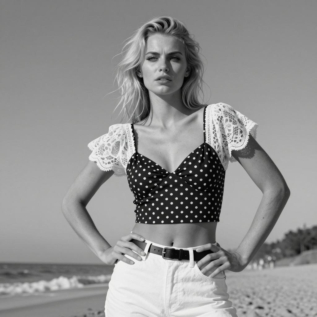 Black and white photograph of a shirtless muscular man with short dark hair, sitting with a towel draped over his lap. A woman with blonde hair in a ponytail, wearing a light-colored dress with cap sleeves, stands behind him, looking to his left. Both have intense expressions. Desert landscape in the background. Two people. Man's left hand on his belt, woman's right hand on her hip.