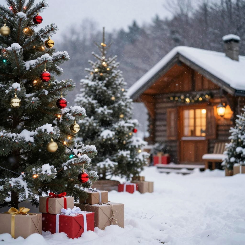 Weihnachtshintergrund featuring a cozy winter scene with softly falling snowflakes, decorated pine trees twinkling with colorful lights, red and gold ornaments, wrapped presents, and a warm glow from a rustic cottage in the background, capturing festive holiday spirit.