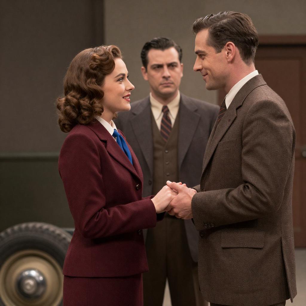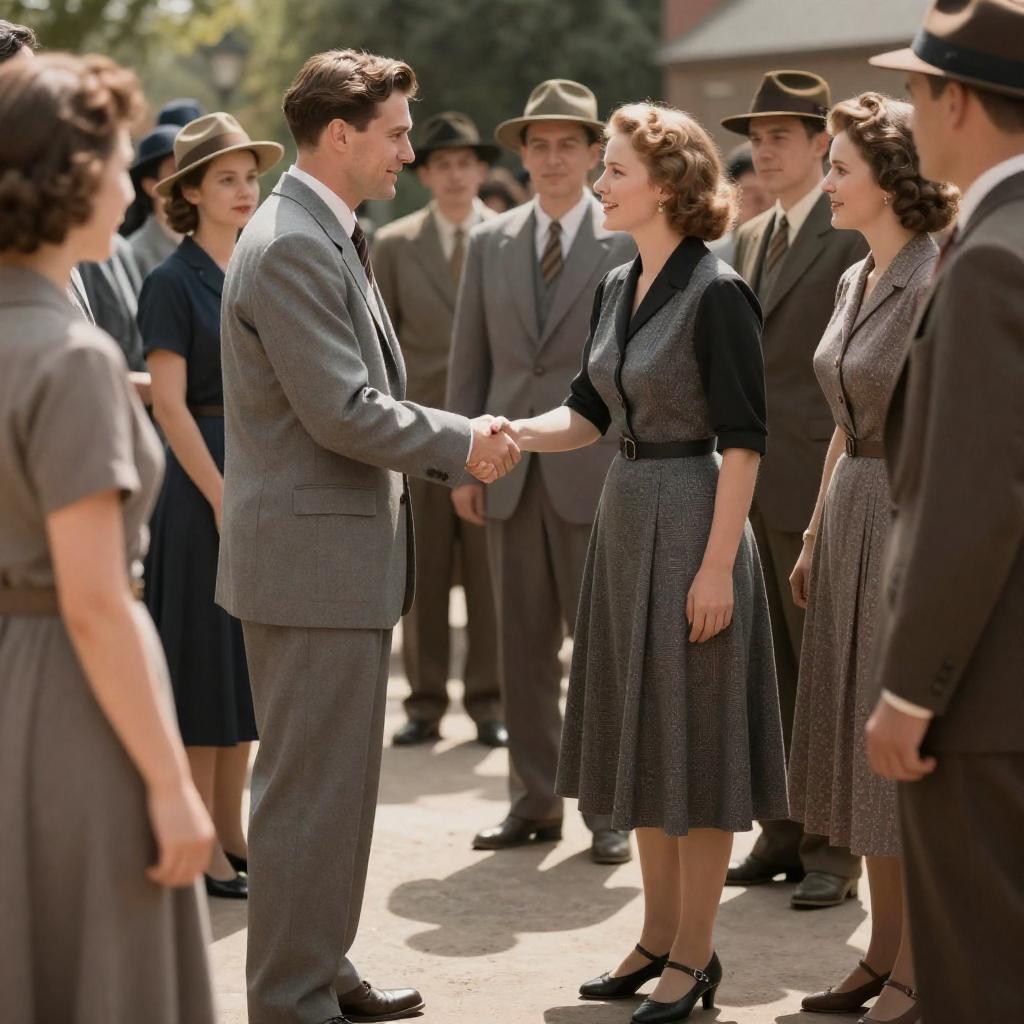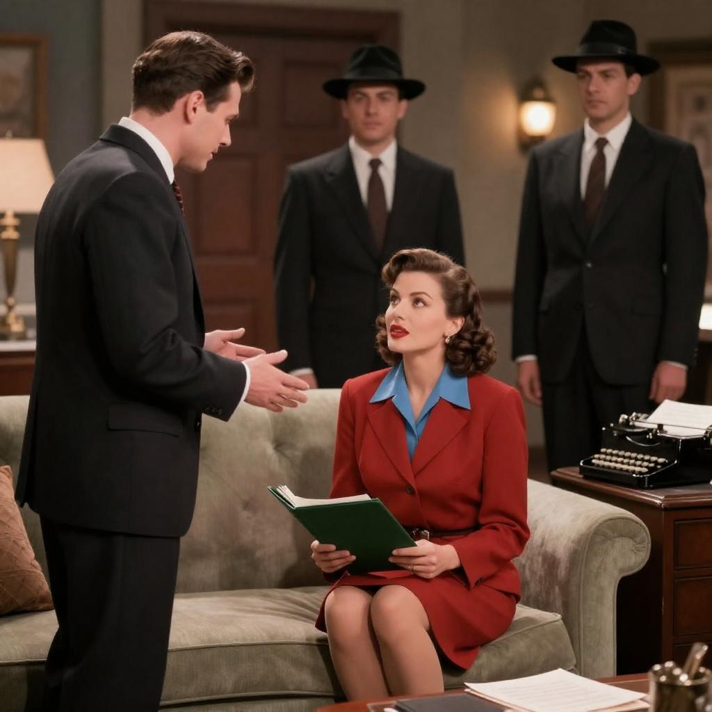 A vintage-style illustration shows a man in a dark suit and white shirt, holding a briefcase, exchanging papers with a woman in a black dress and yellow blouse. Another woman in a blue dress and red skirt stands to the right, holding a bag. They are in a brightly lit room with a white door and a lamp in the background.
