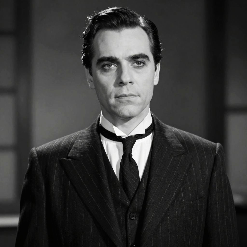 A man dressed in a classic Gomez Addams costume, featuring a sharply tailored pinstripe suit, white shirt, and dark tie, evokes the iconic style of the Addams Family patriarch. The black-and-white cinematic realism enhances the vintage and dramatic flair of this editorial fashion shot.
