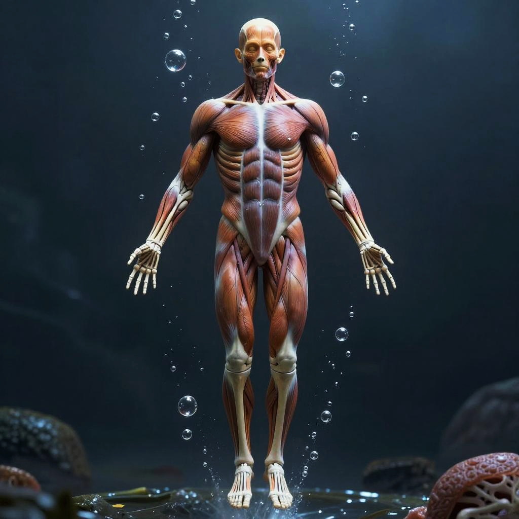 Digital CGI image of a muscular, bald, anatomically detailed male figure underwater, showcasing red and white muscle fibers, with bubbles surrounding him. Dark blue