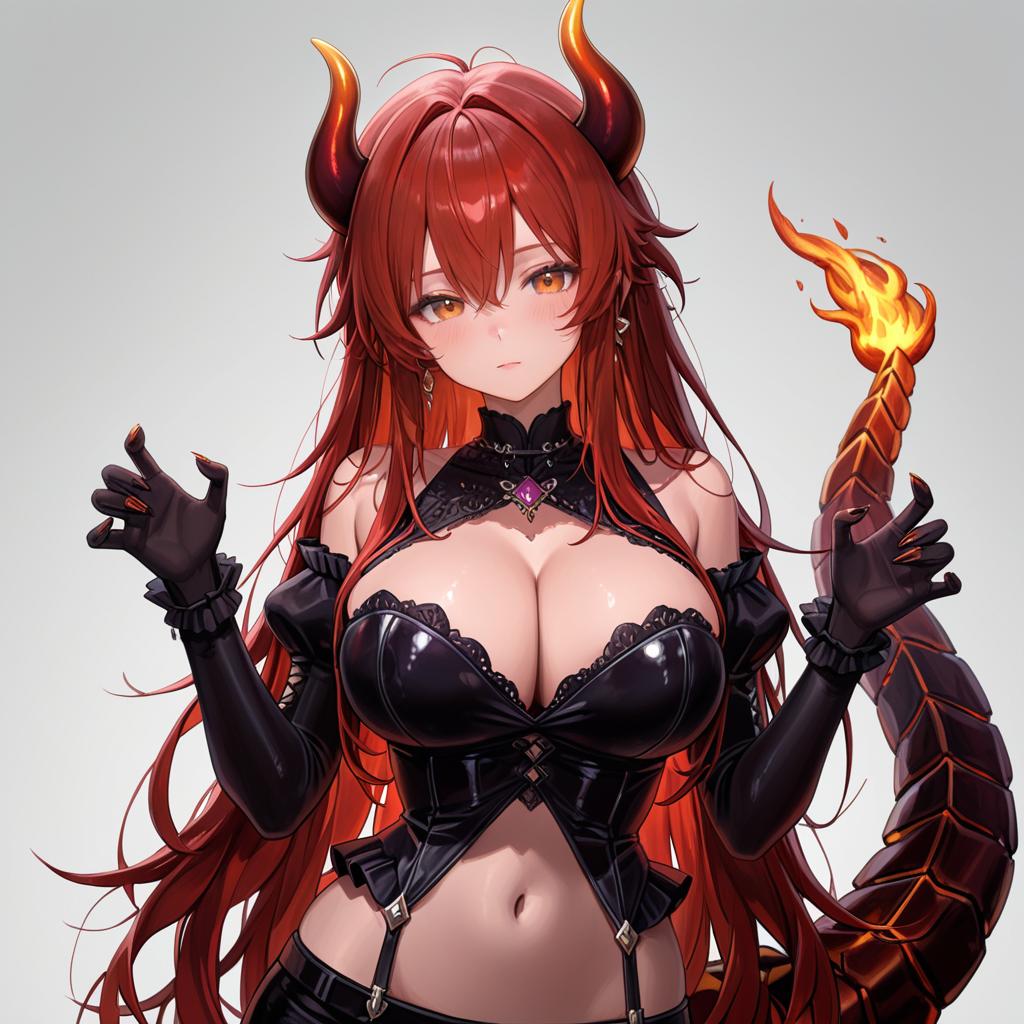 Dola (nijisanji), nijisanji, 1girl, dragon horns, dragon tail, red eyes, hair between eyes, red hair, long hair, very long hair, large breasts, huge breasts, cleavage, navel, virtual youtuber, virtual youtuber, dragon girl, by artist freng, dark_illustrious