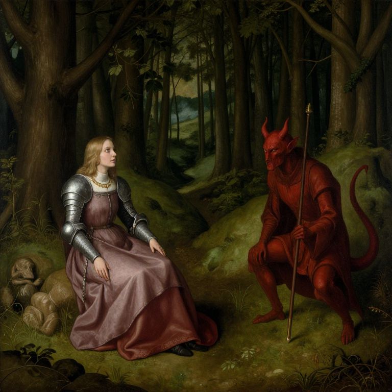 "Lamenting the allegory of the knight, the maiden, and the devil, style of cranach, wide angle, forest background, landscape, enigmatic, allegorical,"