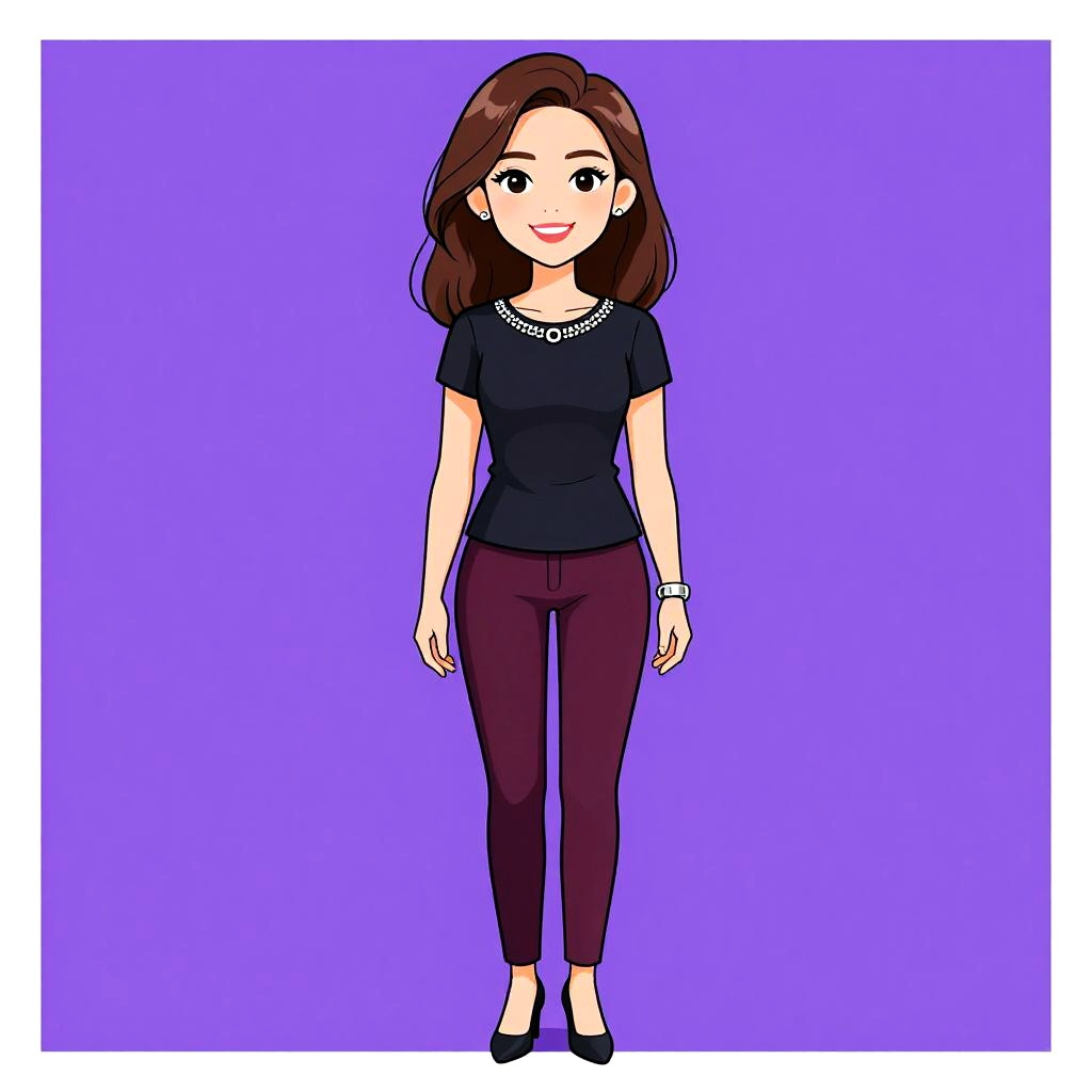 Woman with pretty face and pretty hair. Woman, business casual, tailored black blazer, fitted with structured shoulders, white and black checked blouse, button-up, collar detail, royal blue pencil skirt with peplum waist, knee-length, tan structured handbag with top handles, black strappy heels, minimal jewelry. --sref 1467
