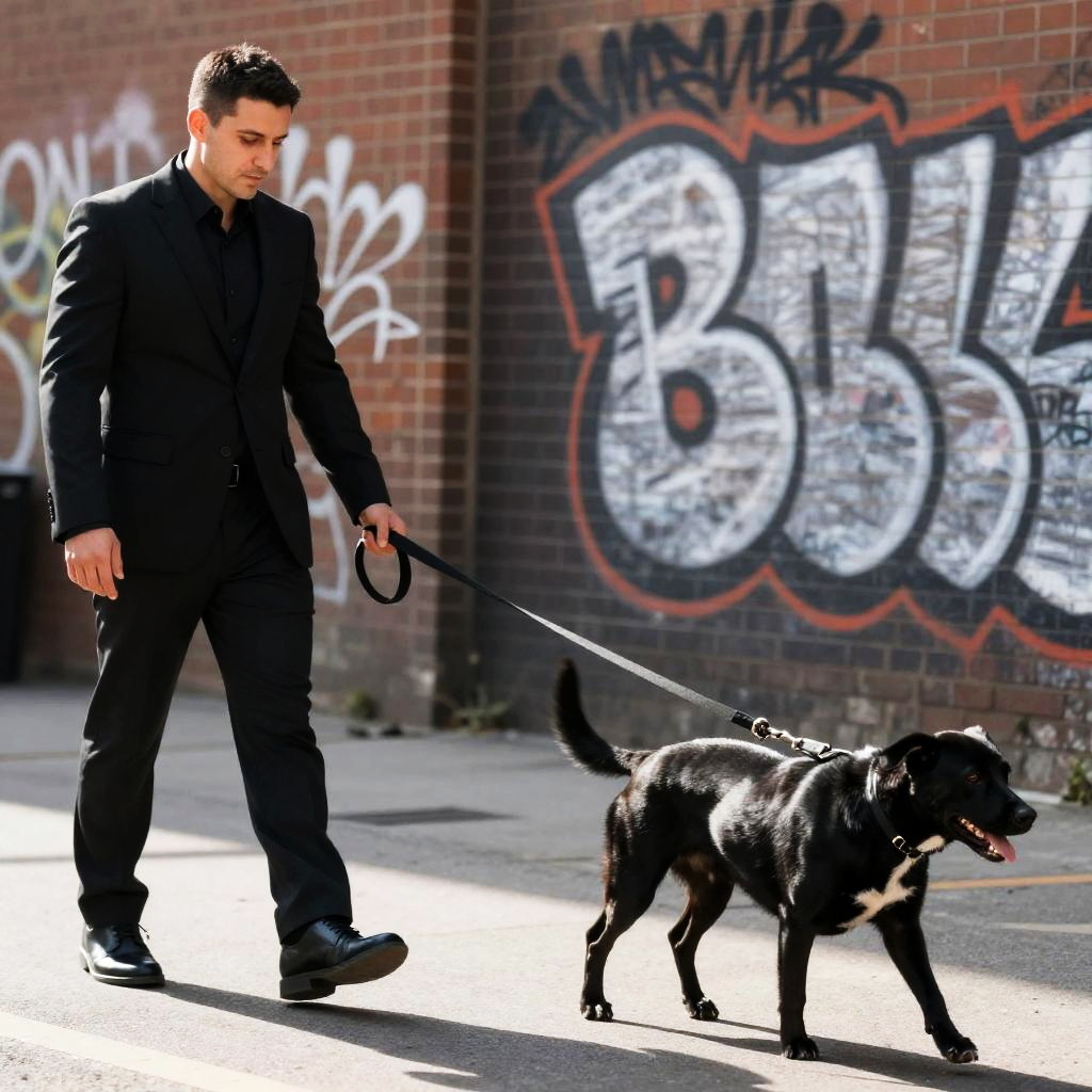 Photograph of a man in a black suit walking a black dog on a leash. The man has short dark hair, a clean-shaven face, and is looking down. Graffiti covers a brick wall in the background. The dog is mid-step, and the wall has a large dark section with white and black graffiti. Sunlight casts shadows on the pavement. The man is on the left, the dog on the right.