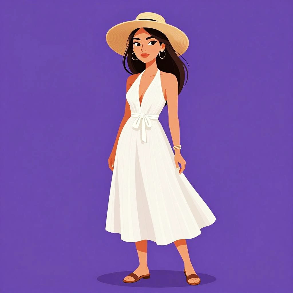 Woman with pretty face and pretty hair. Backless halter dress, A-line cut, airy linen blend, crisp white, subtle pinstripes, deep V neckline, knotted back tie, complemented by flat leather sandals, wide-brimmed sun hat, layered bracelets. --sref 1461