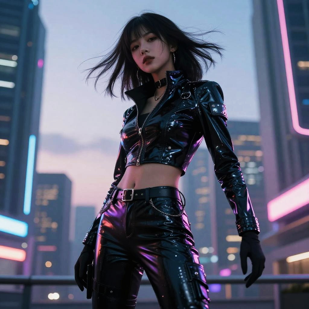 Actriz dressed in a futuristic sci-fi outfit, neon cityscape background, strong confident pose, cyberpunk aesthetic with glowing accessories, dark moody lighting combined with vibrant neon hues, high detail portrait, conceptual art style