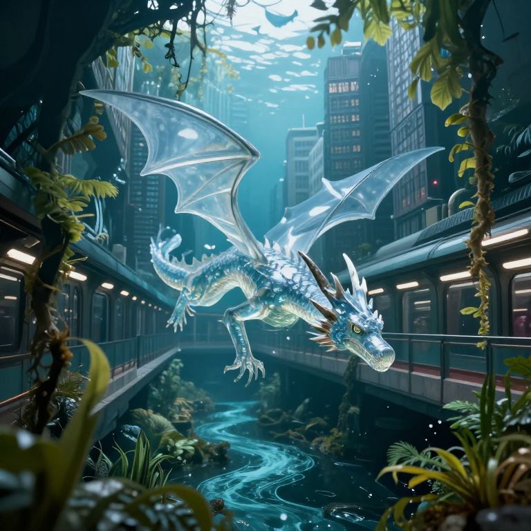 A transparent dragon swims through a metropolis underground, mistaking subways for rivers and towering buildings for kelp forests.