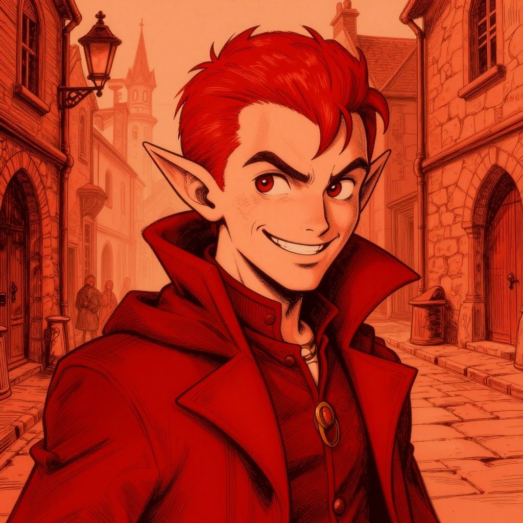 (original-art:1.2), (lineart:1.33), young, 1boy, portrait male elf boy vampire with red hair undercut in medieval city street, close-up, playful grin, heavy-coat, (hyperdefined), (inked-art), red, orange tones, unusual-angle, cartoon, fantasy gothic aesthetic, complex lighting, (flat-colors), hatched-texture, (fine-details:1.2), absurdres, flat-colors, fullscreen, coherent