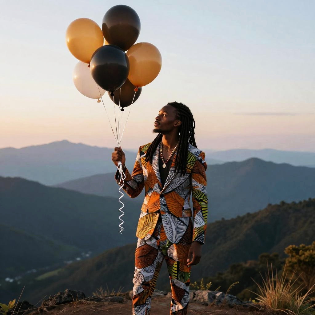 Afrofuturism man with long dreadlocks tied back, holding helium balloons, dressed in modern African print blazer and slacks, majestic mountain range at dawn.