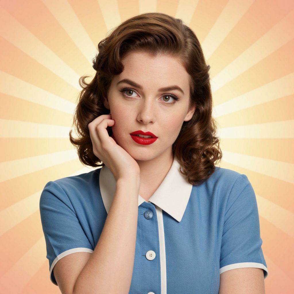 Thoughtful woman with styled brown hair and bold red lipstick rests her chin on her hand against a radiant sunburst background, wearing a vintage-inspired blue dress with white trim and buttons.