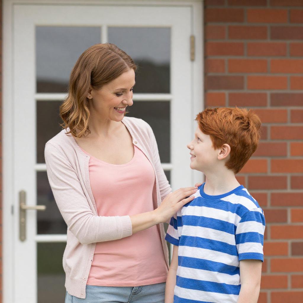 A smiling woman with light brown hair wearing a pink top and light pink cardigan gently touches the shoulder of a young red-haired boy dressed in a blue and white striped shirt. They stand outside, near a white-framed glass door and a red brick wall.