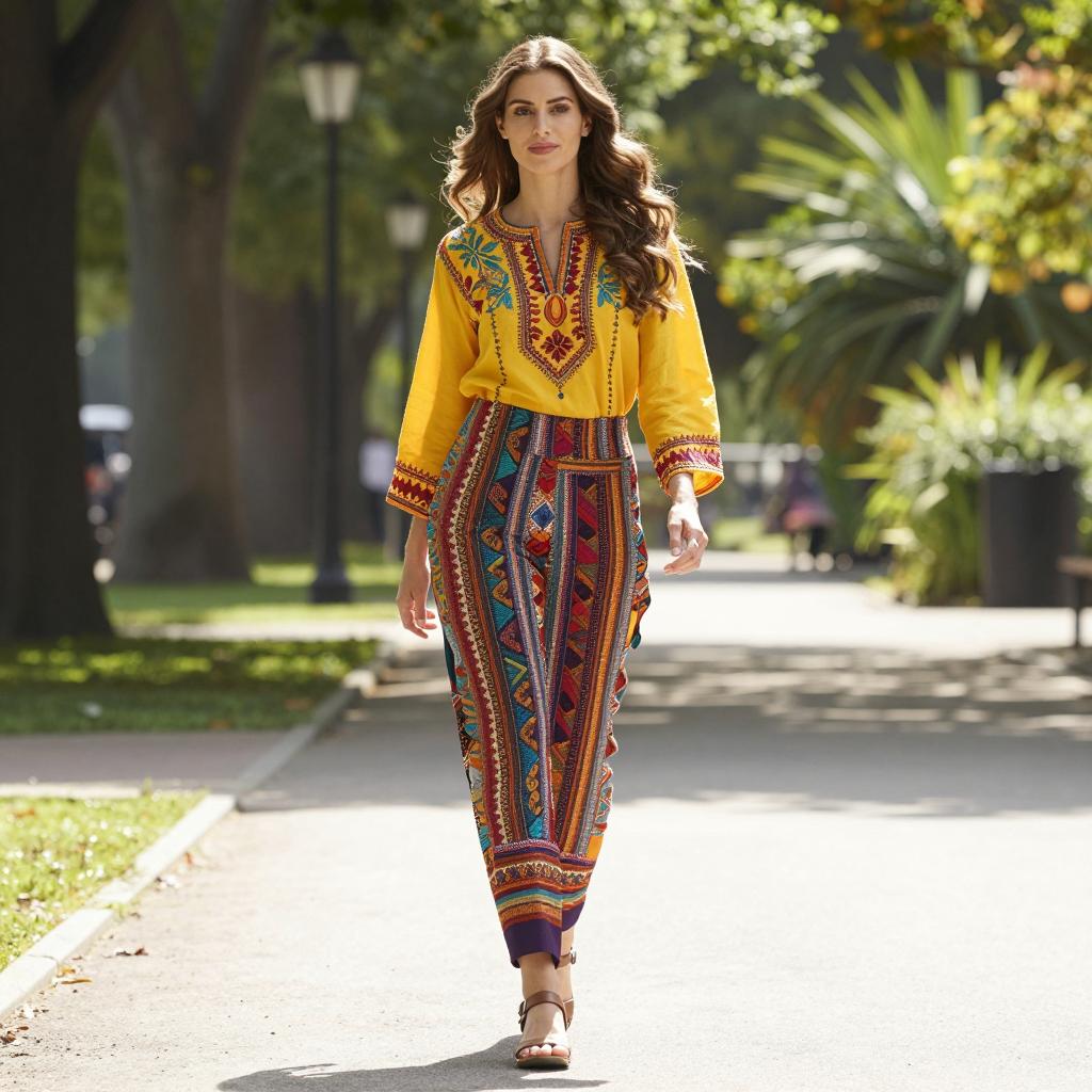 Pants outfit ladies costume, photograph of a woman walking down a sunny park path, wearing a yellow long-sleeve top with intricate embroidery, colorful patterned high-waisted pants, brown sandals, long wavy brown hair, green trees and plants on both sides, sunlight filtering through leaves, daytime, realistic style, fashion model, casual outdoor setting, natural light, warm colors