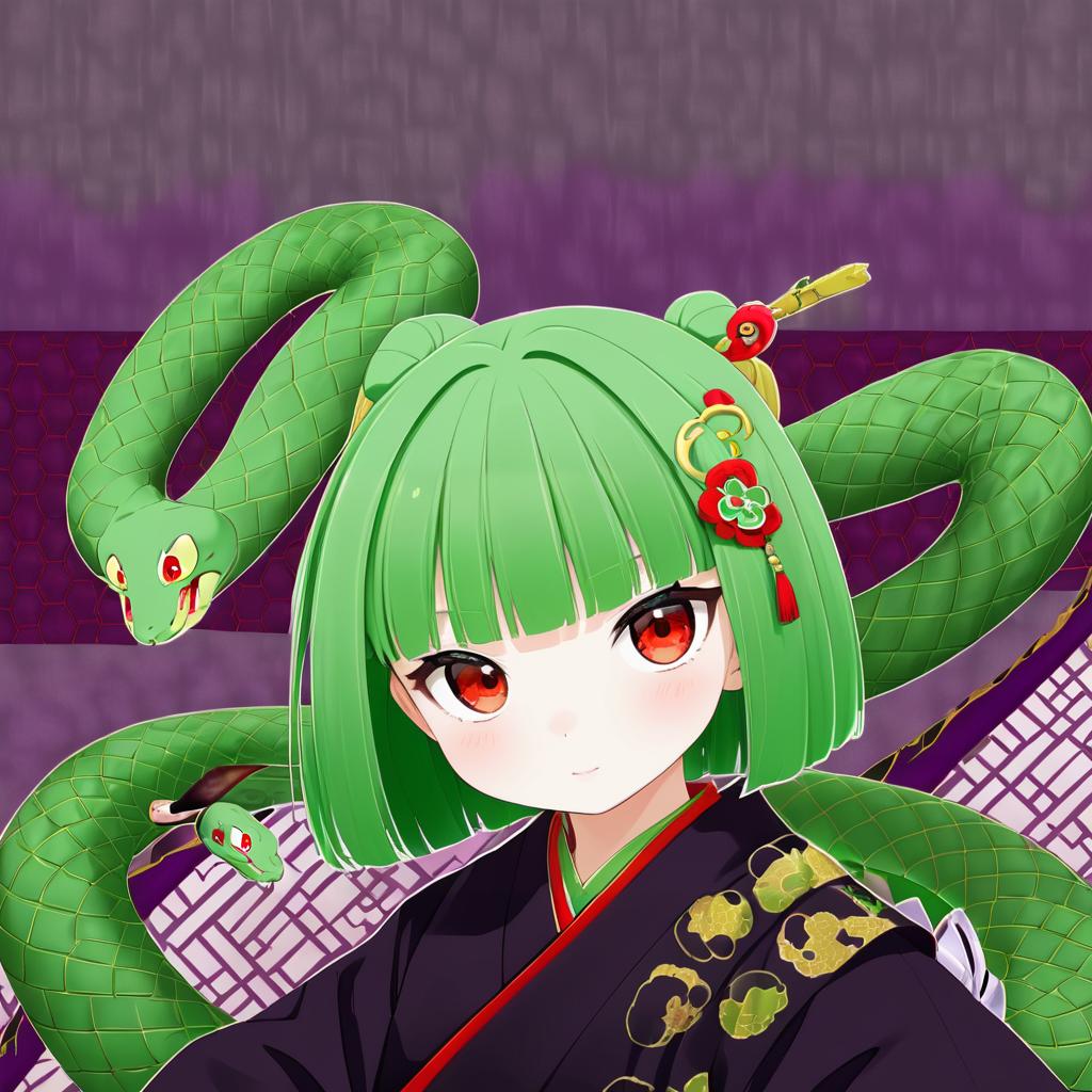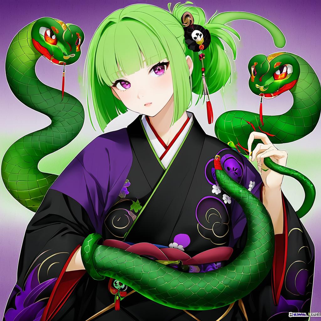 Digital anime-style illustration of a young girl with short green hair, red eyes, and blunt bangs. She wears a traditional black Japanese kimono with gold floral patterns and wide, long sleeves. The character is adorned with a red and green snake hair ornament and has multiple green snake tails surrounding her. The background features purple and violet tones with a geometric pattern.