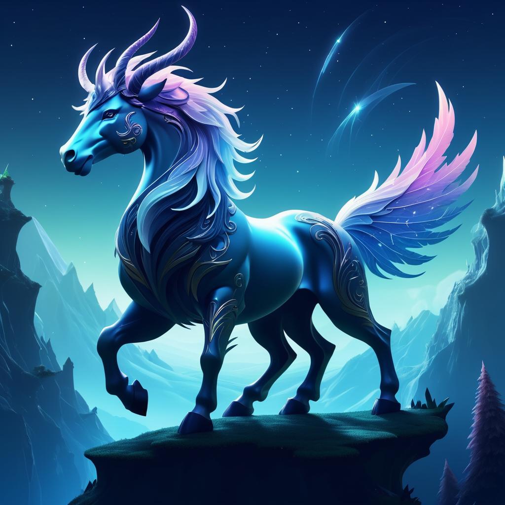 High resolution fantasy illustration of a mythical blue stag with elaborate antlers and flowing mane, standing in a moonlit enchanted forest with tall, bare trees and a glowing crescent moon in the background. The creature features stylized fur and feather-like elements on its tail, giving it a magical and cinematic presence.