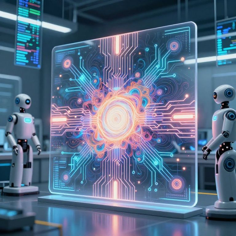 Digital CGI of a futuristic lab with two robotic figures standing beside a glowing, neon-blue circuit board displaying a radiant, central light.
