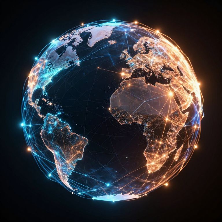 The image presents a striking visual of the Earth globe, enveloped in a complex network of connection lines that symbolize global international connectivity. These lines, glowing in shades of blue and orange, crisscross the globe, representing the intricate web of communication and data exchange that binds the world together. The Earth itself is depicted in a dark, almost black hue, with the continents outlined in a lighter shade, creating a stark contrast against the vibrant network. The connection lines are not uniform; they vary in thickness and intensity, suggesting different levels of connectivity and data flow. The background is a gradient of dark shades, which helps to highlight the globe and the network, making them the focal points of the image. The overall composition is dynamic, with the network lines creating a sense of movement and interconnectivity, emphasizing the futuristic and technological theme of the image. The light effect, with its bright spots and glowing edges, adds a sense of depth and dimension, enhancing the visual impact of the scene.