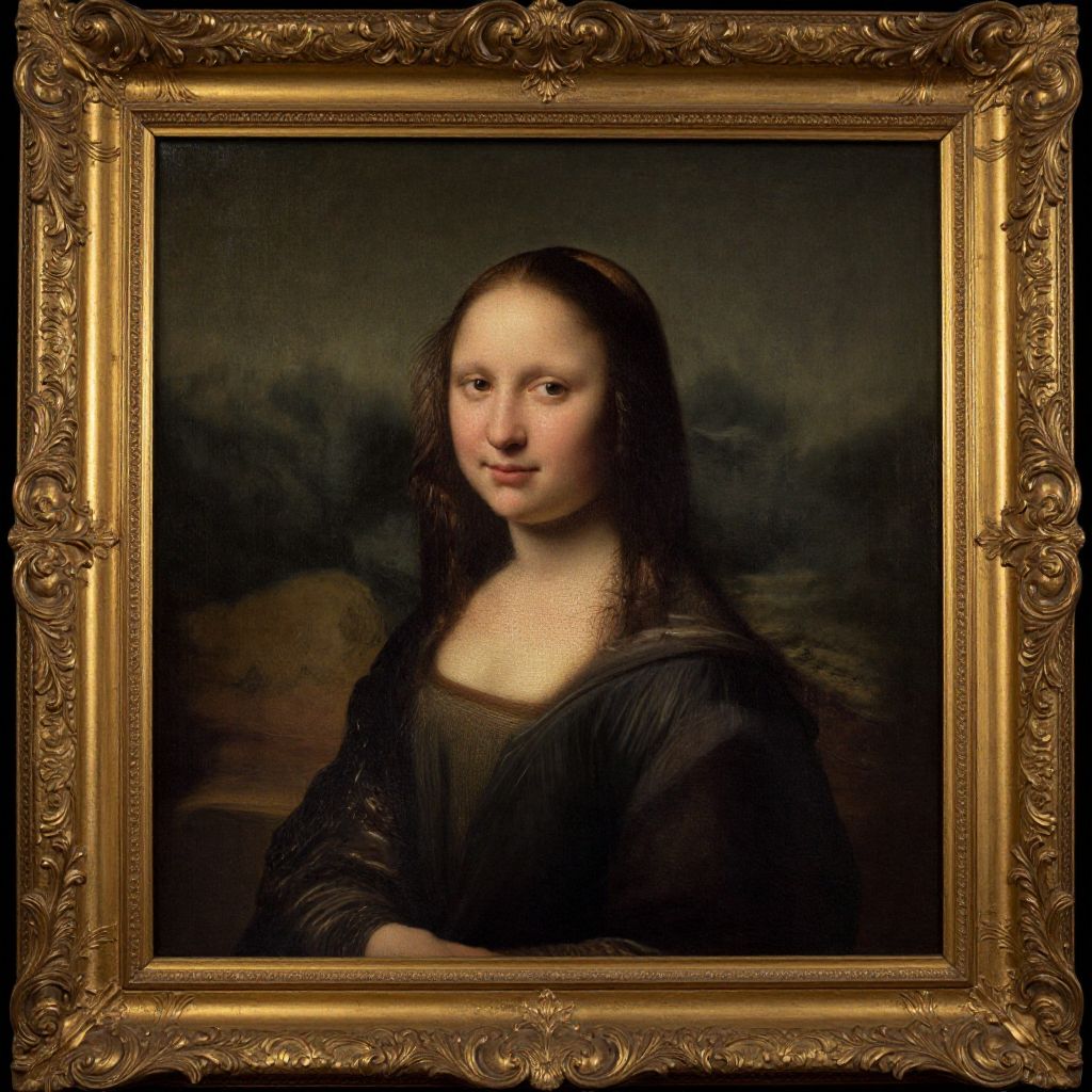 Mona Lisa portrait by Leonardo da Vinci, Renaissance art, woman with enigmatic smile, dark dress, ornate gold frame, dark background.