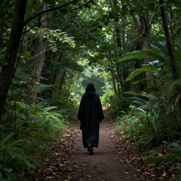 Photograph of a lone person walking down a narrow, dirt path in a dense, green forest. The individual is seen from behind, wearing a dark, hooded cloak that obscures their face and legs, suggesting anonymity. The path is flanked by lush ferns and tall trees with dense foliage, casting dappled sunlight and shadows. The forest floor is covered in brown leaves. The overall mood is mysterious and serene, with the greenery contrasting against the dark cloak, creating a sense of depth and solitude.