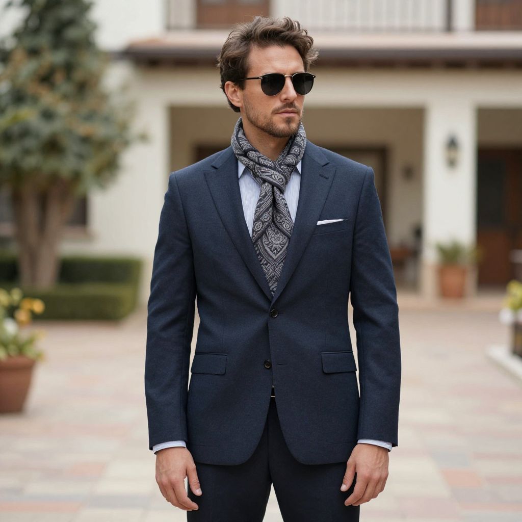 Trendy Costume Man, man in a suit and scarf standing in a courtyard