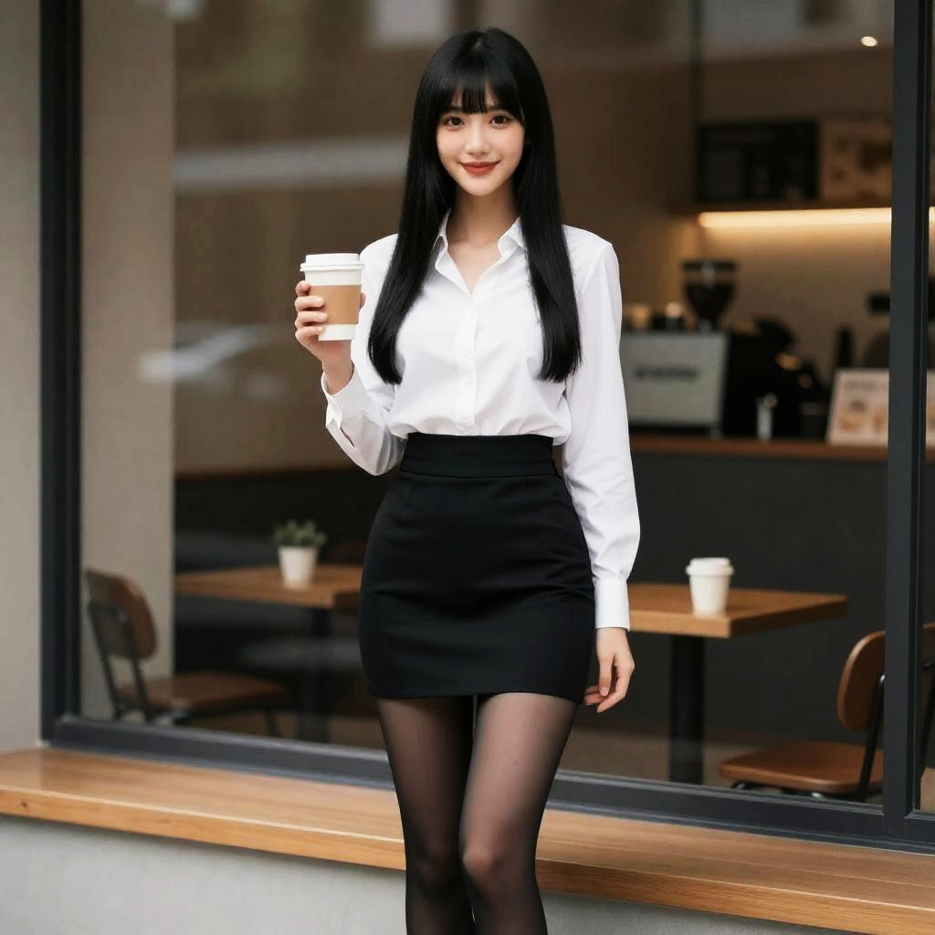 Best quality, masterpiece, photorealistic, 1girl, solo, full body, standing, long black hair, straight hair, blunt bangs, looking at viewer, smile, cyb skirt, cyb shirt, high-waist skirt, black pantyhose, holding coffee, in cafe, window, detailed background