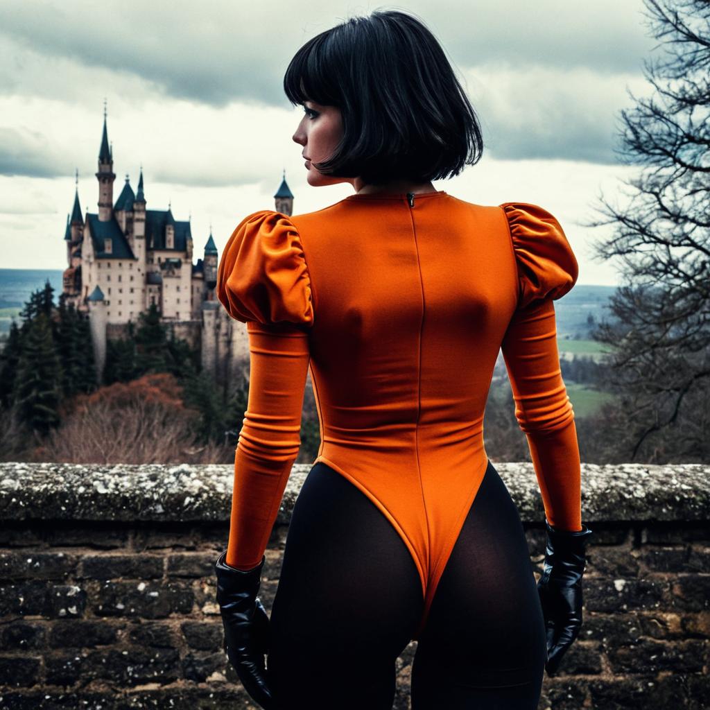 Photograph-style digital artwork of a woman with a short black bob haircut, standing with her back to the viewer. She is wearing a form-fitting, bright orange jumpsuit with puffed, short sleeves. The jumpsuit accentuates her curvy figure, particularly her prominent buttocks. She stands on a balcony with white columns, overlooking a grand, fairy-tale castle with multiple turrets and blue-gray roofs. The background includes a cloudy sky and green trees. The image has a slightly exaggerated, cartoonish quality.
